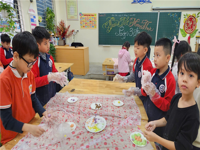 Các em học sinh lớp 3A3 đã rất hào hứng tham gia vào từng công đoạn, từ việc nặn bột, vo viên bánh, đến việc luộc bánh. Dưới sự hướng dẫn của các thầy cô và các bậc phụ huynh, các em còn được tự tay chuẩn bị nhân mật ngọt ngào cho bánh trôi.