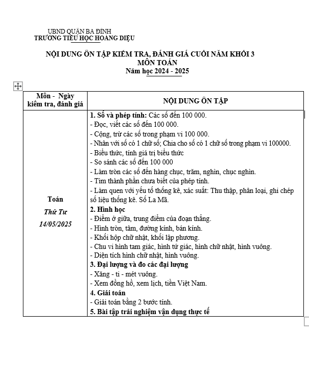 Để các con có sự chuẩn bị tốt cho kỳ kiểm tra cuối năm, giáo viên khối 3 gửi tới quý phụ huynh và học sinh nội dung ôn tập cùng lịch kiểm tra môn Toán. Kính mong sự đồng hành và động viên của quý phụ huynh để các con tự tin bước vào kỳ thi sắp tới. Chúc các con ôn tập thật tốt để đạt kết quả cao!