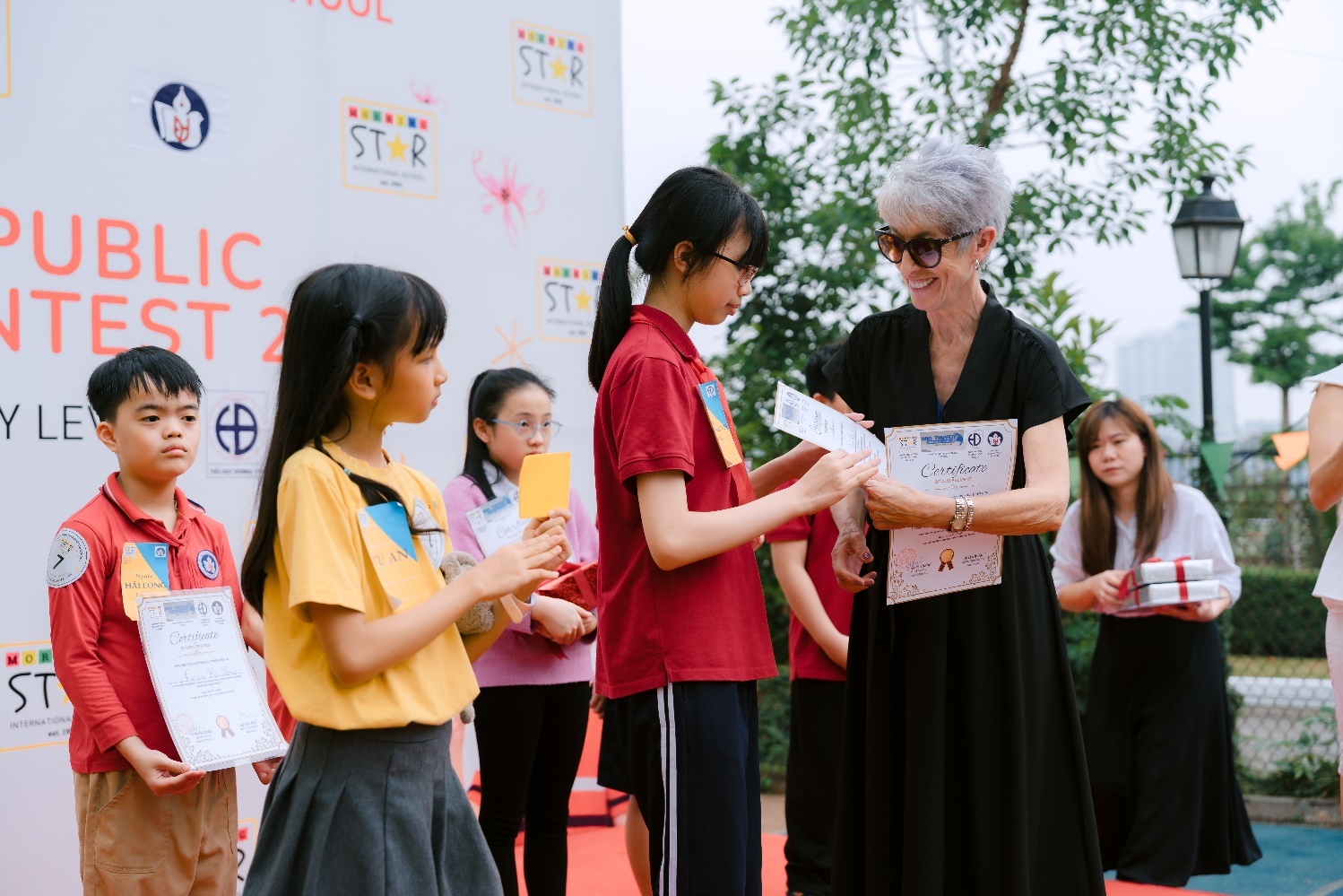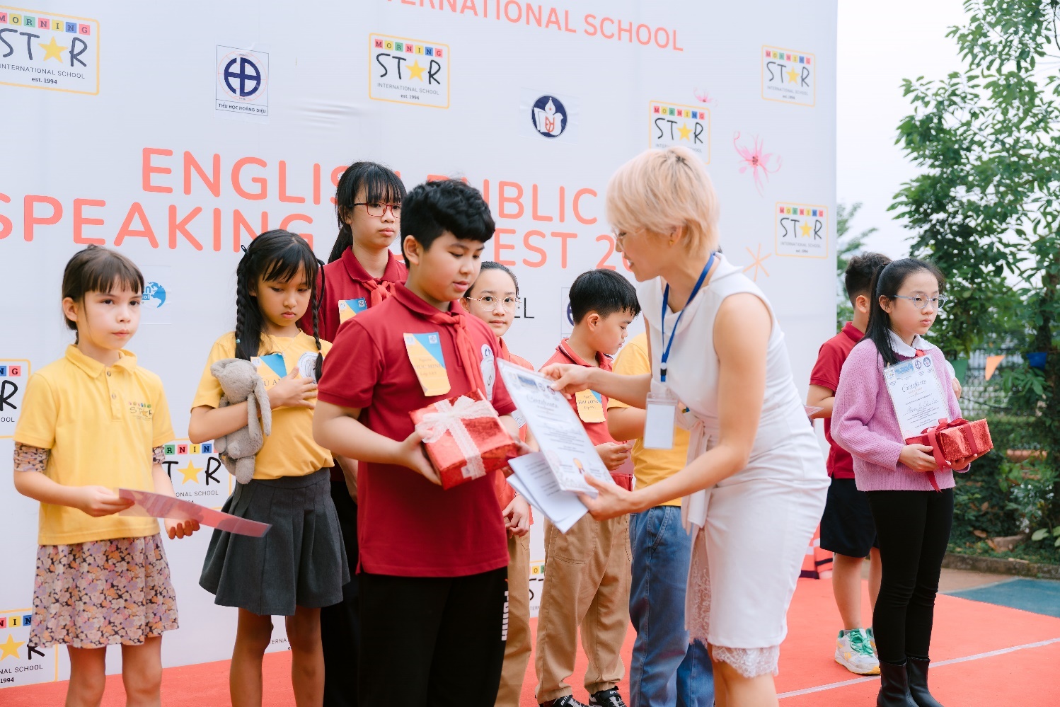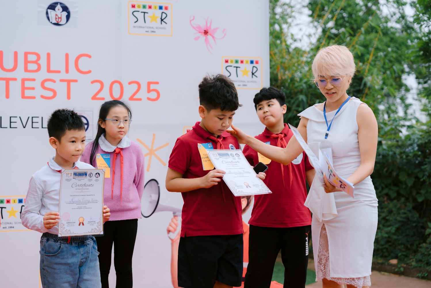 Đại diện cho Trường Tiểu học Hoàng Diệu, cô giáo tiếng Anh Nguyễn Thanh Hiền đã đồng hành cùng ba học sinh ưu tú: Nguyễn Phúc Minh (lớp 5A5), Nguyễn Gia Hưng (lớp 5A9)Phạm Khánh Ngân (lớp 5A1) – những gương mặt trẻ đầy triển vọng, mang đến tinh thần tự tin và sẵn sàng chinh phục thử thách.