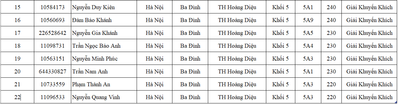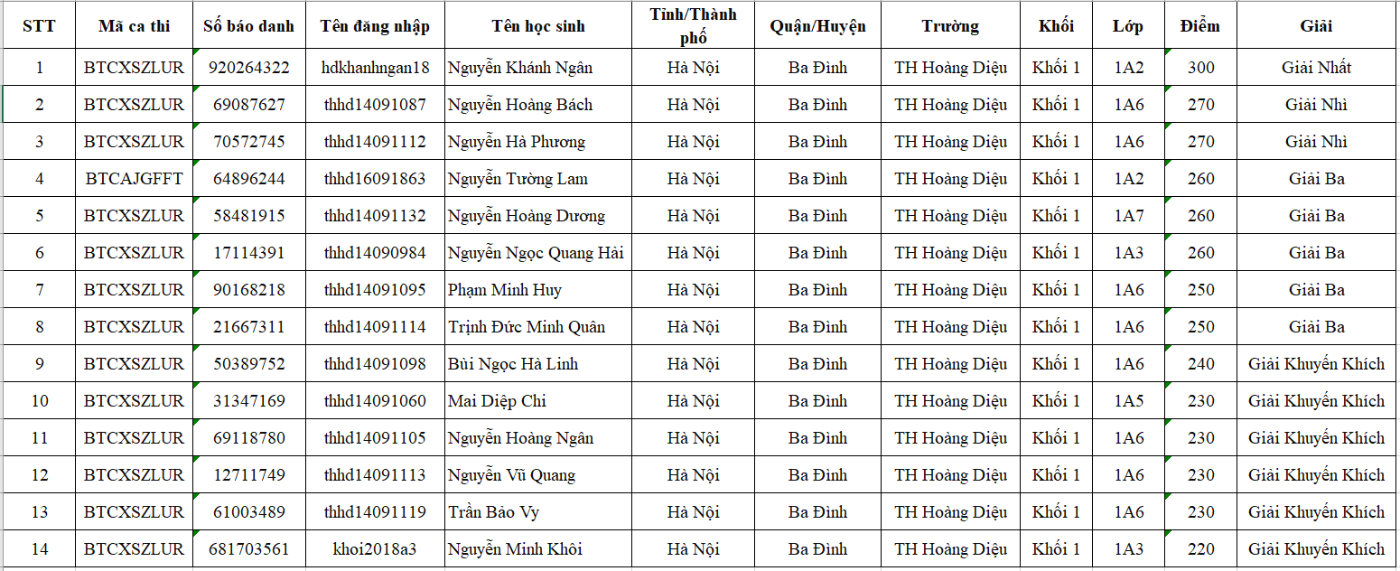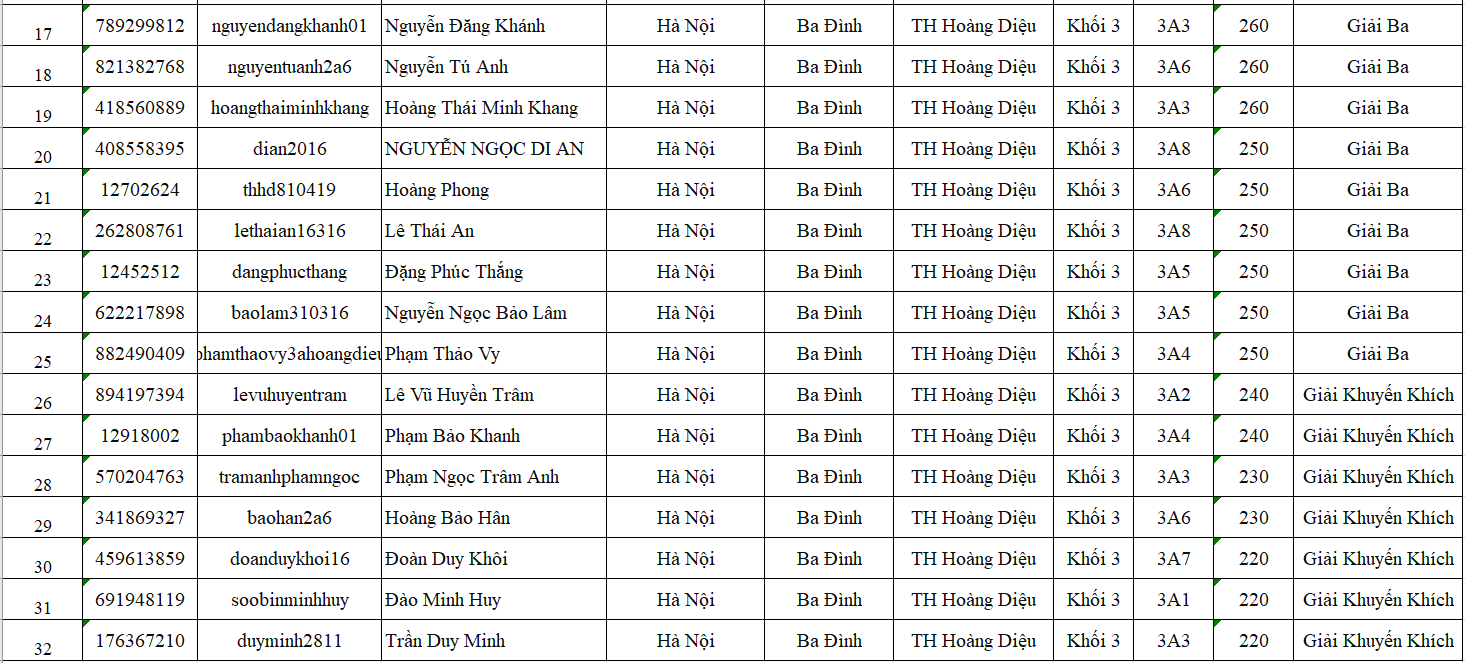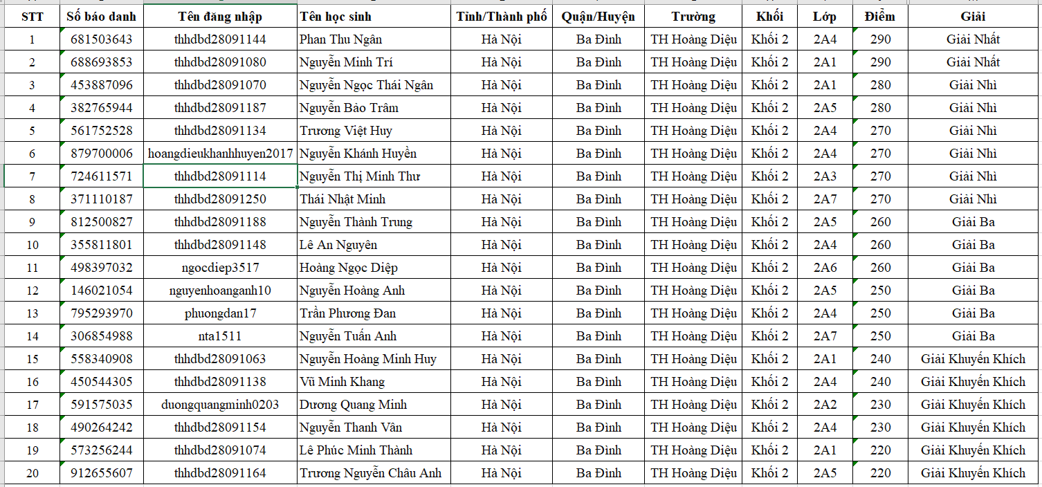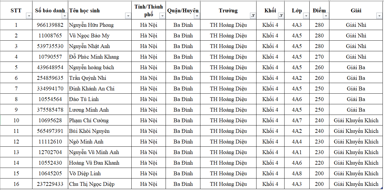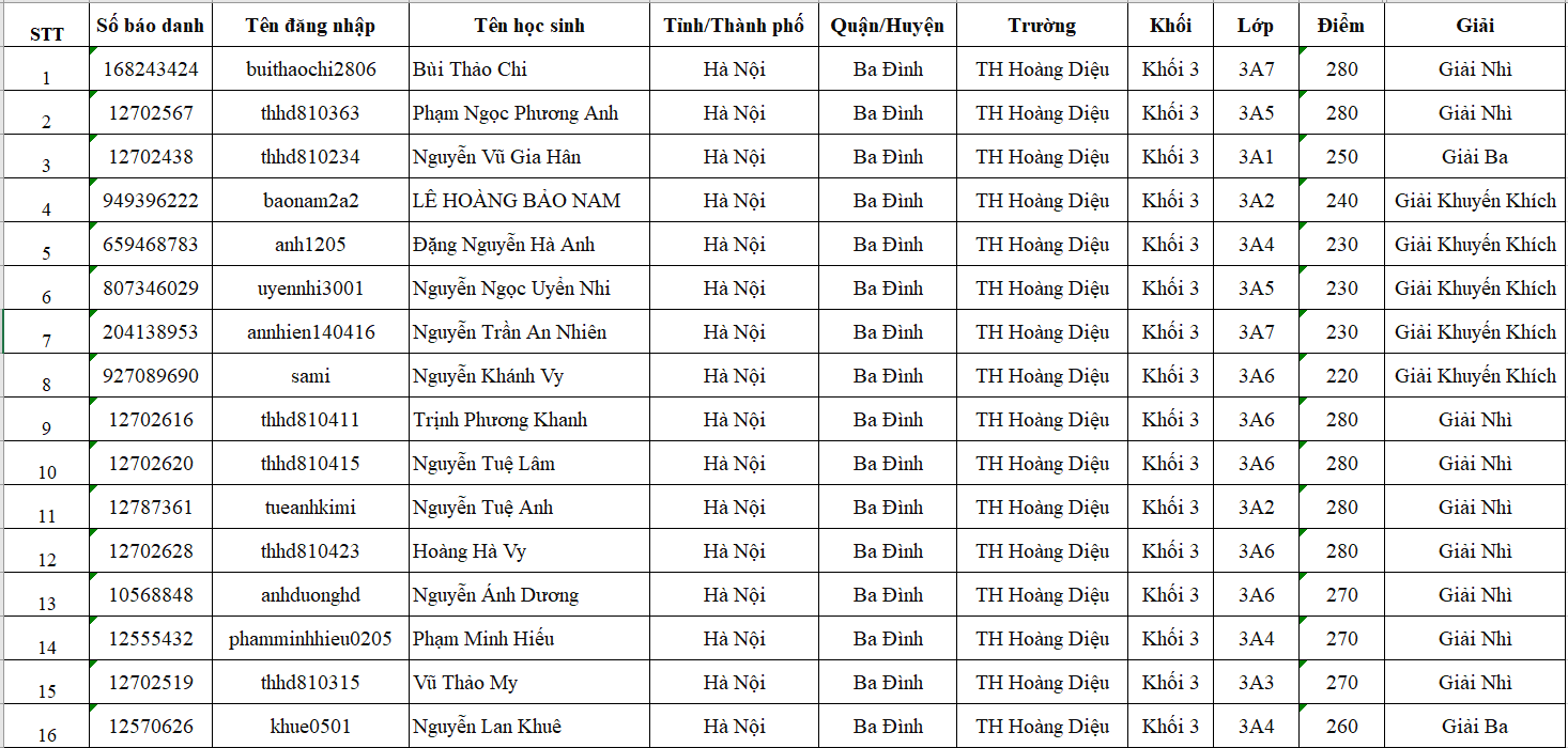 Trường Tiểu học Hoàng Diệu trân trọng thông báo kết quả xếp giải Vòng thi Hội - cấp Thành phố sân chơi Trạng Nguyên Tiếng Việt năm học 2024 - 2025. Xin chúc mừng các bạn học sinh đã hoàn thành xuất sắc vòng thi này.