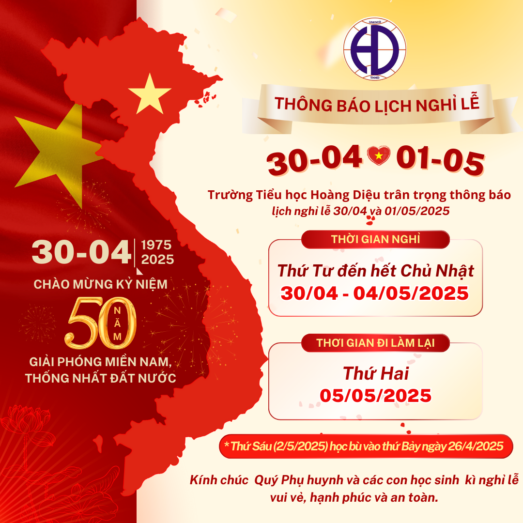 Trường Tiểu học Hoàng Diệu thông báo lịch nghỉ lễ 30/4 - 1/5 năm 2025, cụ thể như sau: