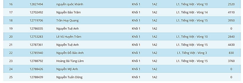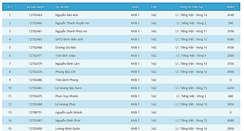 Sân chơi Trạng nguyên Tiếng Việt đã trải qua 15 vòng thi, hiện tại các trạng nguyên nhí đang chuẩn bị chờ đón vòng thi 16 - vòng thi Trạng Nguyên cấp trường. Trường Tiểu học Hoàng Diệu xin gửi tới các thầy cô giáo, các quý vị phụ huynh và các con học sinh thông tin về danh sách học sinh lớp 1A2 tham gia cuộc thi Trạng nguyên Tiếng Việt đến thời điểm hiện tại cùng điểm thi của các con. Từ nay đến khi tổ chức vòng thi cấp trường vẫn còn nhiều thời gian để các con tham gia sân chơi này. Nếu bạn nào chưa thi hết vòng 15, các con hãy tiếp tục làm bài thi nhé. Nếu bạn nào muốn tham gia, hãy tạo tài khoản và tham gia thi ngay nhé. Nhà trường mong các con hãy nỗ lực cố gắng thử sức và giành những điểm số cao trong cuộc thi thú vị và bổ ích này.