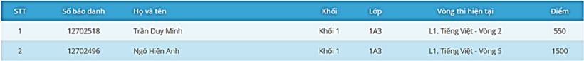 Sân chơi Trạng nguyên Tiếng Việt đã trải qua 15 vòng thi, hiện tại các trạng nguyên nhí đang chuẩn bị chờ đón vòng thi 16 - vòng thi Trạng Nguyên cấp trường. Trường Tiểu học Hoàng Diệu xin gửi tới các thầy cô giáo, các quý vị phụ huynh và các con học sinh thông tin về danh sách học sinh lớp 1A3 tham gia cuộc thi Trạng nguyên Tiếng Việt đến thời điểm hiện tại cùng điểm thi của các con. Từ nay đến khi tổ chức vòng thi cấp trường vẫn còn nhiều thời gian để các con tham gia sân chơi này. Nếu bạn nào chưa thi hết vòng 15, các con hãy tiếp tục làm bài thi nhé. Nếu bạn nào muốn tham gia, hãy tạo tài khoản và tham gia thi ngay nhé. Nhà trường mong các con hãy nỗ lực cố gắng thử sức và giành những điểm số cao trong cuộc thi thú vị và bổ ích này.