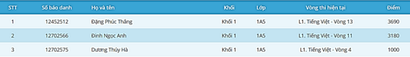 Sân chơi Trạng nguyên Tiếng Việt đã trải qua 15 vòng thi, hiện tại các trạng nguyên nhí đang chuẩn bị chờ đón vòng thi 16 - vòng thi Trạng Nguyên cấp trường. Trường Tiểu học Hoàng Diệu xin gửi tới các thầy cô giáo, các quý vị phụ huynh và các con học sinh thông tin về danh sách học sinh lớp 1A5 tham gia cuộc thi Trạng nguyên Tiếng Việt đến thời điểm hiện tại cùng điểm thi của các con. Từ nay đến khi tổ chức vòng thi cấp trường vẫn còn nhiều thời gian để các con tham gia sân chơi này. Nếu bạn nào chưa thi hết vòng 15, các con hãy tiếp tục làm bài thi nhé. Nếu bạn nào muốn tham gia, hãy tạo tài khoản và tham gia thi ngay nhé. Nhà trường mong các con hãy nỗ lực cố gắng thử sức và giành những điểm số cao trong cuộc thi thú vị và bổ ích này.