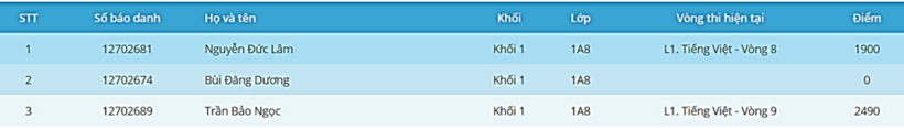 Sân chơi Trạng nguyên Tiếng Việt đã trải qua 15 vòng thi, hiện tại các trạng nguyên nhí đang chuẩn bị chờ đón vòng thi 16 - vòng thi Trạng Nguyên cấp trường. Trường Tiểu học Hoàng Diệu xin gửi tới các thầy cô giáo, các quý vị phụ huynh và các con học sinh thông tin về danh sách học sinh lớp 1A8 tham gia cuộc thi Trạng nguyên Tiếng Việt đến thời điểm hiện tại cùng điểm thi của các con. Từ nay đến khi tổ chức vòng thi cấp trường vẫn còn nhiều thời gian để các con tham gia sân chơi này. Nếu bạn nào chưa thi hết vòng 15, các con hãy tiếp tục làm bài thi nhé. Nếu bạn nào muốn tham gia, hãy tạo tài khoản và tham gia thi ngay nhé. Nhà trường mong các con hãy nỗ lực cố gắng thử sức và giành những điểm số cao trong cuộc thi thú vị và bổ ích này.