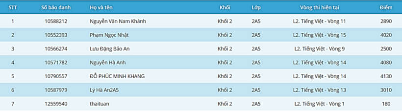 Sân chơi Trạng nguyên Tiếng Việt đã trải qua 15 vòng thi, hiện tại các trạng nguyên nhí đang chuẩn bị chờ đón vòng thi 16 - vòng thi Trạng Nguyên cấp trường. Trường Tiểu học Hoàng Diệu xin gửi tới các thầy cô giáo, các quý vị phụ huynh và các con học sinh thông tin về danh sách học sinh lớp 2A5 tham gia cuộc thi Trạng nguyên Tiếng Việt đến thời điểm hiện tại cùng điểm thi của các con. Từ nay đến khi tổ chức vòng thi cấp trường vẫn còn nhiều thời gian để các con tham gia sân chơi này. Nếu bạn nào chưa thi hết vòng 15, các con hãy tiếp tục làm bài thi nhé. Nếu bạn nào muốn tham gia, hãy tạo tài khoản và tham gia thi ngay nhé. Nhà trường mong các con hãy nỗ lực cố gắng thử sức và giành những điểm số cao trong cuộc thi thú vị và bổ ích này.
