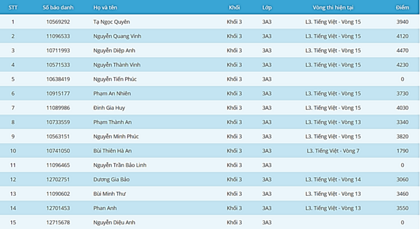 Sân chơi Trạng nguyên Tiếng Việt đã trải qua 15 vòng thi, hiện tại các trạng nguyên nhí đang chuẩn bị chờ đón vòng thi 16 - vòng thi Trạng Nguyên cấp trường. Trường Tiểu học Hoàng Diệu xin gửi tới các thầy cô giáo, các quý vị phụ huynh và các con học sinh thông tin về danh sách học sinh lớp 3A3 tham gia cuộc thi Trạng nguyên Tiếng Việt đến thời điểm hiện tại cùng điểm thi của các con. Từ nay đến khi tổ chức vòng thi cấp trường vẫn còn nhiều thời gian để các con tham gia sân chơi này. Nếu bạn nào chưa thi hết vòng 15, các con hãy tiếp tục làm bài thi nhé. Nếu bạn nào muốn tham gia, hãy tạo tài khoản và tham gia thi ngay nhé. Nhà trường mong các con hãy nỗ lực cố gắng thử sức và giành những điểm số cao trong cuộc thi thú vị và bổ ích này.
