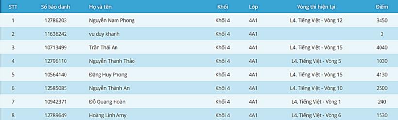 Sân chơi Trạng nguyên Tiếng Việt đã trải qua 15 vòng thi, hiện tại các trạng nguyên nhí đang chuẩn bị chờ đón vòng thi 16 - vòng thi Trạng Nguyên cấp trường. Trường Tiểu học Hoàng Diệu xin gửi tới các thầy cô giáo, các quý vị phụ huynh và các con học sinh thông tin về danh sách học sinh lớp 4A1 tham gia cuộc thi Trạng nguyên Tiếng Việt đến thời điểm hiện tại cùng điểm thi của các con. Từ nay đến khi tổ chức vòng thi cấp trường vẫn còn nhiều thời gian để các con tham gia sân chơi này. Nếu bạn nào chưa thi hết vòng 15, các con hãy tiếp tục làm bài thi nhé. Nếu bạn nào muốn tham gia, hãy tạo tài khoản và tham gia thi ngay nhé. Nhà trường mong các con hãy nỗ lực cố gắng thử sức và giành những điểm số cao trong cuộc thi thú vị và bổ ích này.