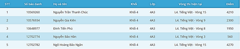 Sân chơi Trạng nguyên Tiếng Việt đã trải qua 15 vòng thi, hiện tại các trạng nguyên nhí đang chuẩn bị chờ đón vòng thi 16 - vòng thi Trạng Nguyên cấp trường. Trường Tiểu học Hoàng Diệu xin gửi tới các thầy cô giáo, các quý vị phụ huynh và các con học sinh thông tin về danh sách học sinh lớp 4A3 tham gia cuộc thi Trạng nguyên Tiếng Việt đến thời điểm hiện tại cùng điểm thi của các con. Từ nay đến khi tổ chức vòng thi cấp trường vẫn còn nhiều thời gian để các con tham gia sân chơi này. Nếu bạn nào chưa thi hết vòng 15, các con hãy tiếp tục làm bài thi nhé. Nếu bạn nào muốn tham gia, hãy tạo tài khoản và tham gia thi ngay nhé. Nhà trường mong các con hãy nỗ lực cố gắng thử sức và giành những điểm số cao trong cuộc thi thú vị và bổ ích này.