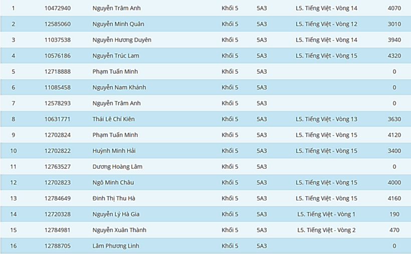 Sân chơi Trạng nguyên Tiếng Việt đã trải qua 15 vòng thi, hiện tại các trạng nguyên nhí đang chuẩn bị chờ đón vòng thi 16 - vòng thi Trạng Nguyên cấp trường. Trường Tiểu học Hoàng Diệu xin gửi tới các thầy cô giáo, các quý vị phụ huynh và các con học sinh thông tin về danh sách học sinh lớp 5A3 tham gia cuộc thi Trạng nguyên Tiếng Việt đến thời điểm hiện tại cùng điểm thi của các con. Từ nay đến khi tổ chức vòng thi cấp trường vẫn còn nhiều thời gian để các con tham gia sân chơi này. Nếu bạn nào chưa thi hết vòng 15, các con hãy tiếp tục làm bài thi nhé. Nếu bạn nào muốn tham gia, hãy tạo tài khoản và tham gia thi ngay nhé. Nhà trường mong các con hãy nỗ lực cố gắng thử sức và giành những điểm số cao trong cuộc thi thú vị và bổ ích này.