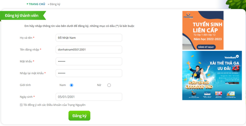 Bước 2: Điền thông tin học sinh