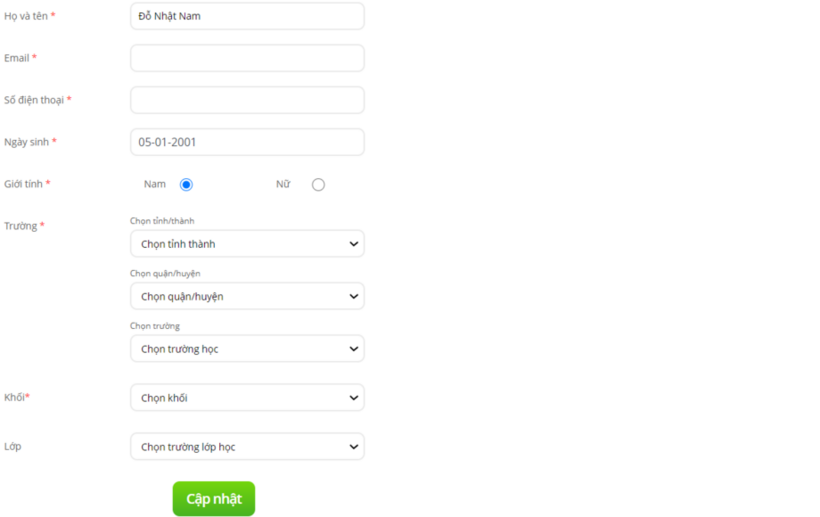 Cập nhật đúng thông tin Số điện thoại - Tỉnh – Huyện – Trường - Khối – Lớp của học sinh và click “Cập nhật” để hoàn thành.