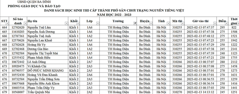 Lịch thi dự kiến Vòng thi Trạng nguyên Tiếng Việt cấp Thành phố năm học 2022 - 2023 sẽ diễn ra vào ngày 24/03/2023. Dưới đây là danh sách học sinh đủ điều kiện tham gia thi Trạng nguyên Tiếng Việt cấp Thành phố năm học 2022 - 2023 do Phòng Giáo dục và Ban tổ chức cuộc thi Trạng nguyên Tiếng Việt lựa chọn.