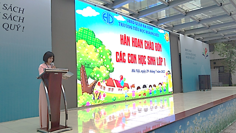 Trong không khí hân hoan, háo hức của buổi lễ, cô giáo Trần Thị Tố Trinh – Phó Hiệu trưởng nhà trường đã lên thay mặt tập thể cán bộ giáo viên nhân viên nhà trường gửi lời chào và lời chúc thân thương nhất tới các con học sinh khối 1.