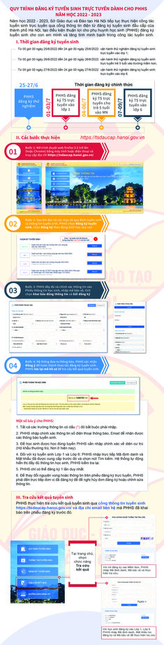 Năm học 2022 - 2023, Sở GD&ĐT Hà Nội tiếp tục thực hiện công tác tuyển sinh trực tuyến qua cổng thông tin điện tử đăng kí tuyển sinh đầu cấp của thành phố Hà Nội, tạo điều kiện thuận lợi cho phụ huynh học sinh đăng kí tuyển sinh cho con em mình và tăng tính minh bạch cho công tác tuyển sinh.