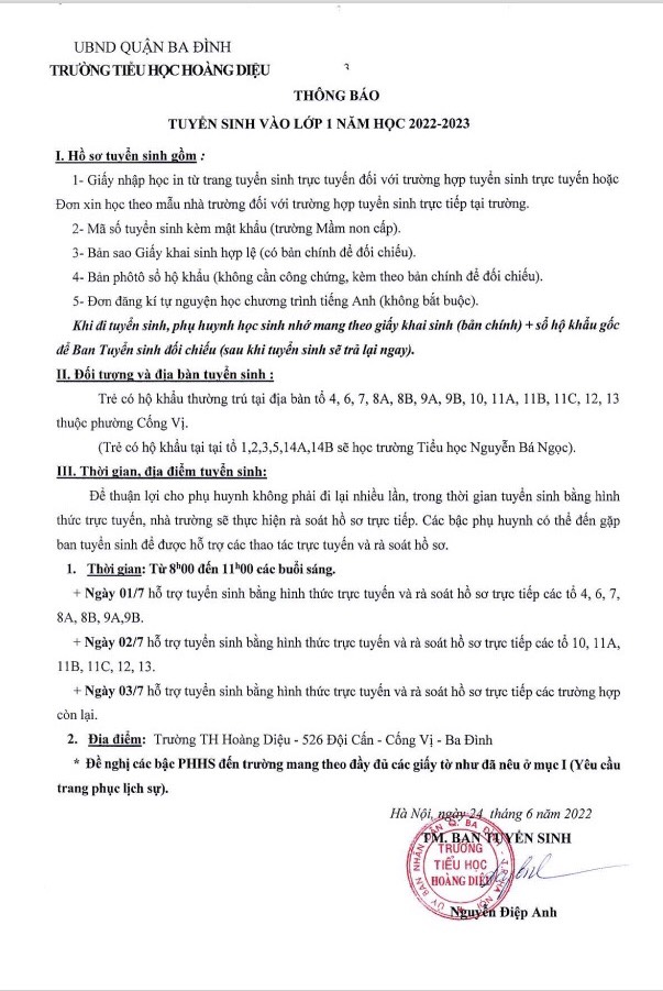 Nguồn: Ban Tuyển sinh trường TH Hoàng Diệu