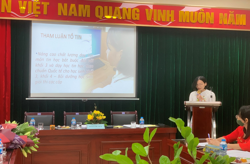 Đ/c Bùi Thị Minh Châu – Giáo viên Khối 4 trình bày tham luận trong Hội nghị