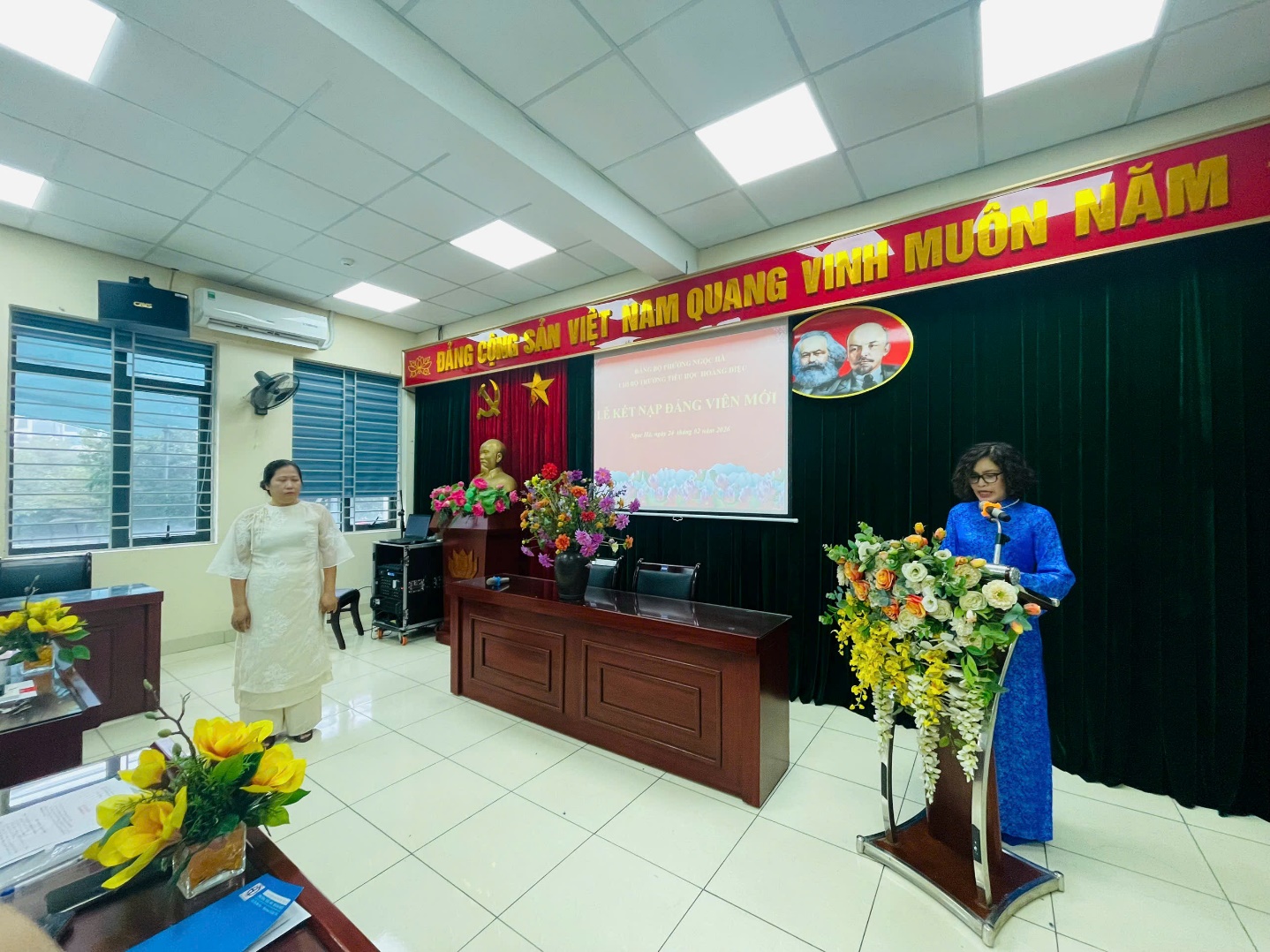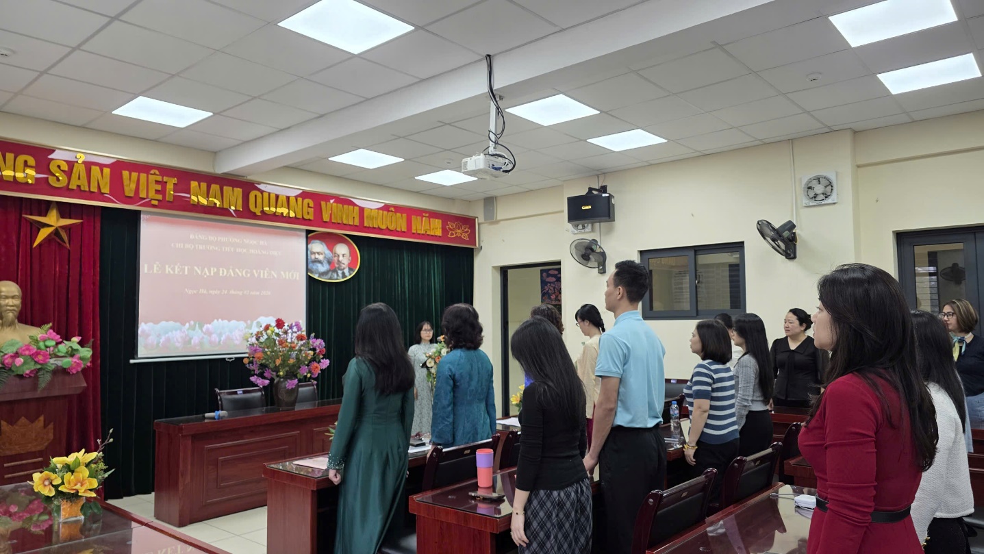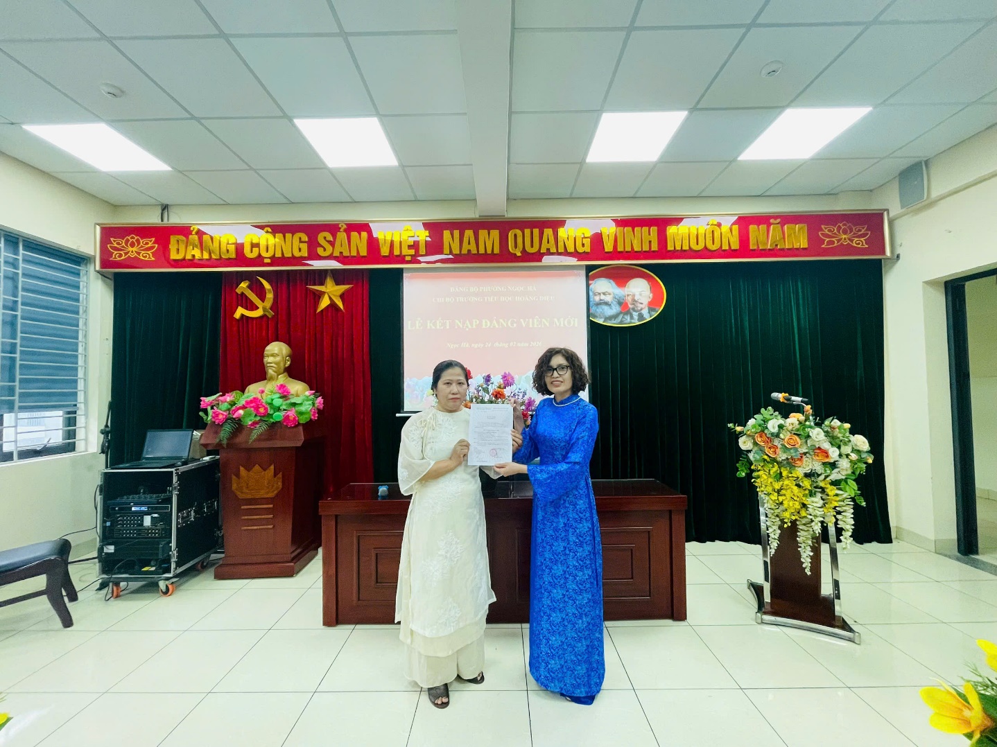 Thay mặt Chi ủy, đồng chí Lưu Thị Hồng Hạnh – Bí thư Chi bộ, Hiệu trưởng nhà trường đã công bố và trao quyết định kết nạp Đảng viên của Đảng ủy phường Ngọc Hà cho đồng chí Nguyễn Thị Thanh Huệ. Đứng trước cờ Tổ quốc, cờ Đảng và chân dung Chủ tịch Hồ Chí Minh, đồng chí Huệ đã dõng dạc đọc lời tuyên thệ, hứa sẽ luôn tuyệt đối trung thành với lý tưởng của Đảng, không ngừng học tập và rèn luyện để hoàn thành xuất sắc mọi nhiệm vụ được giao.