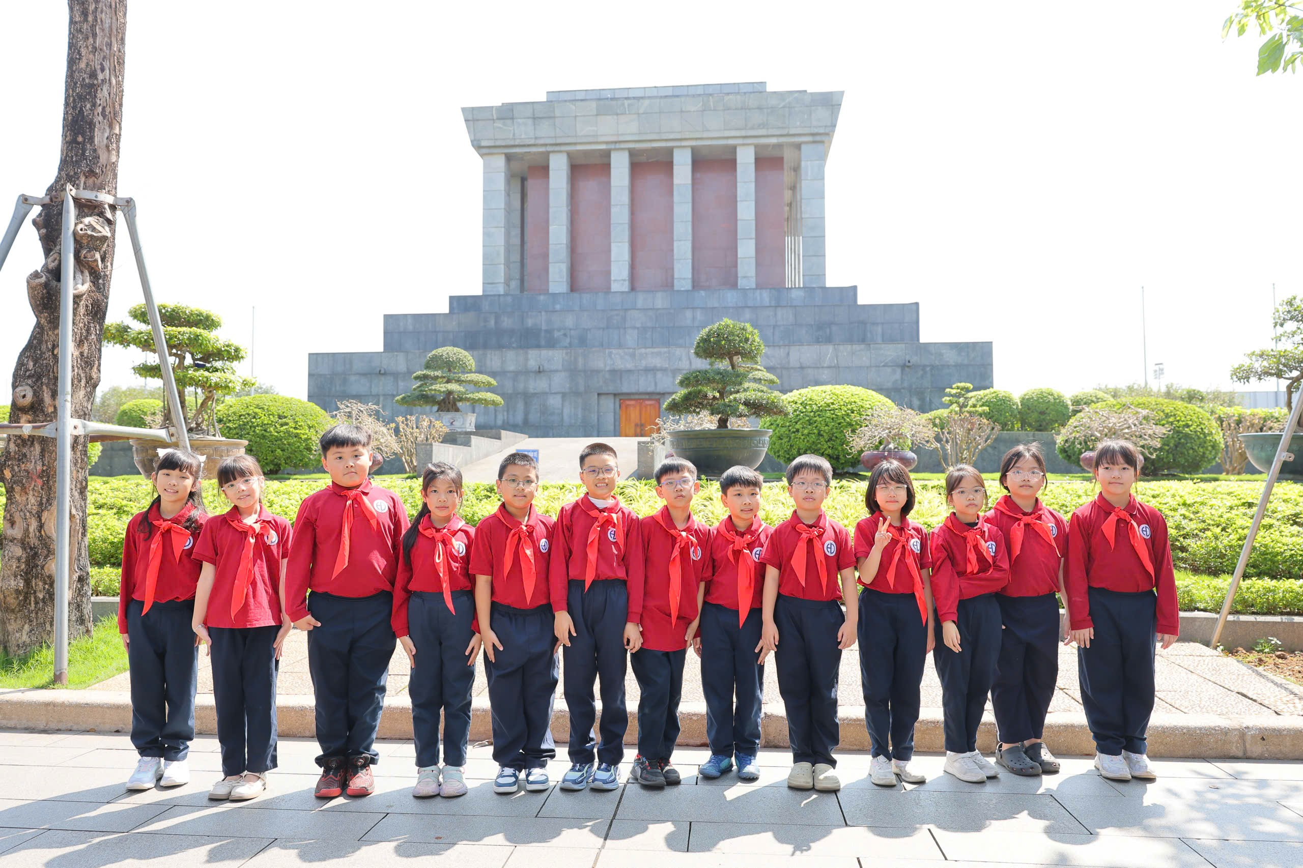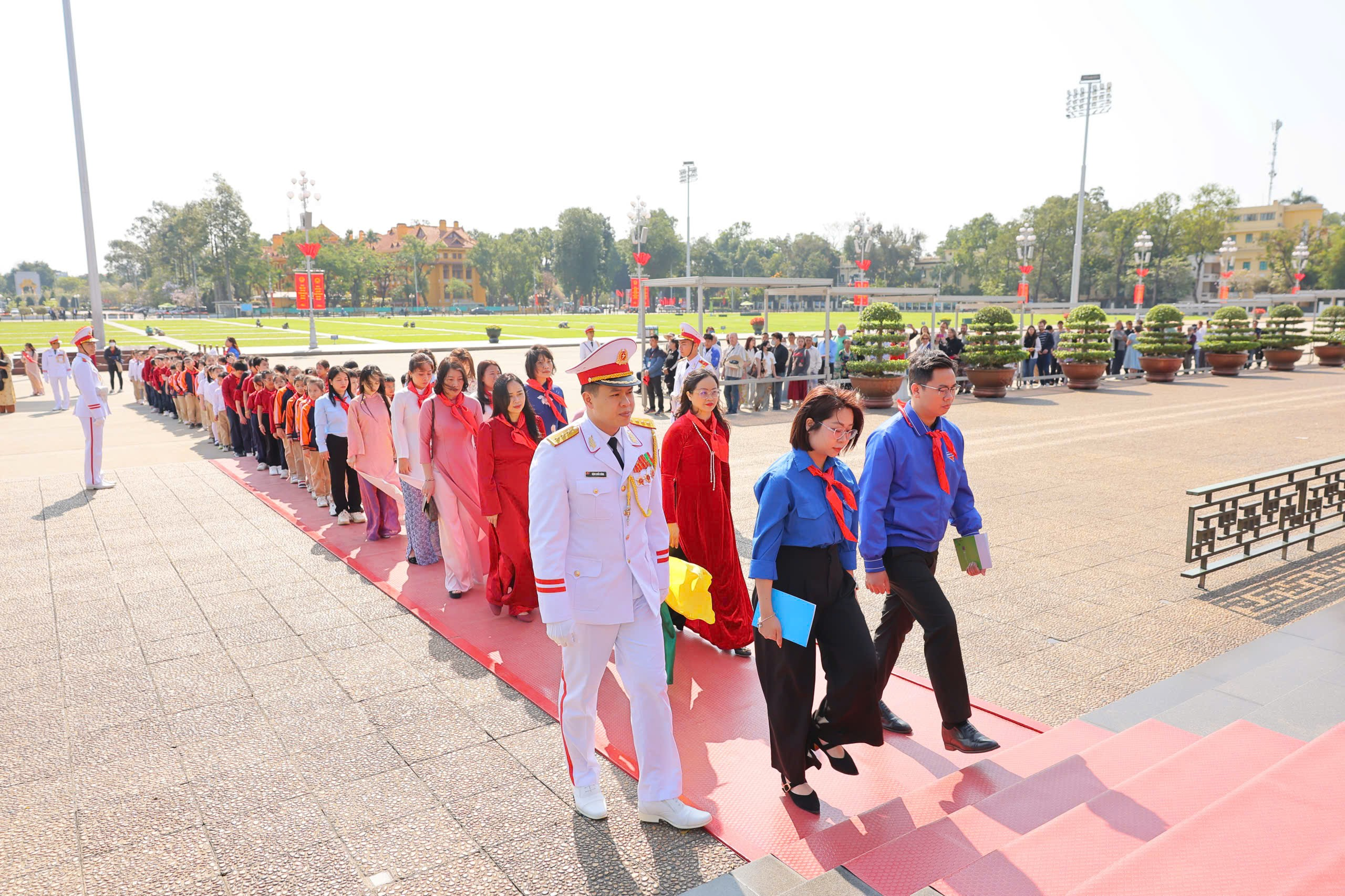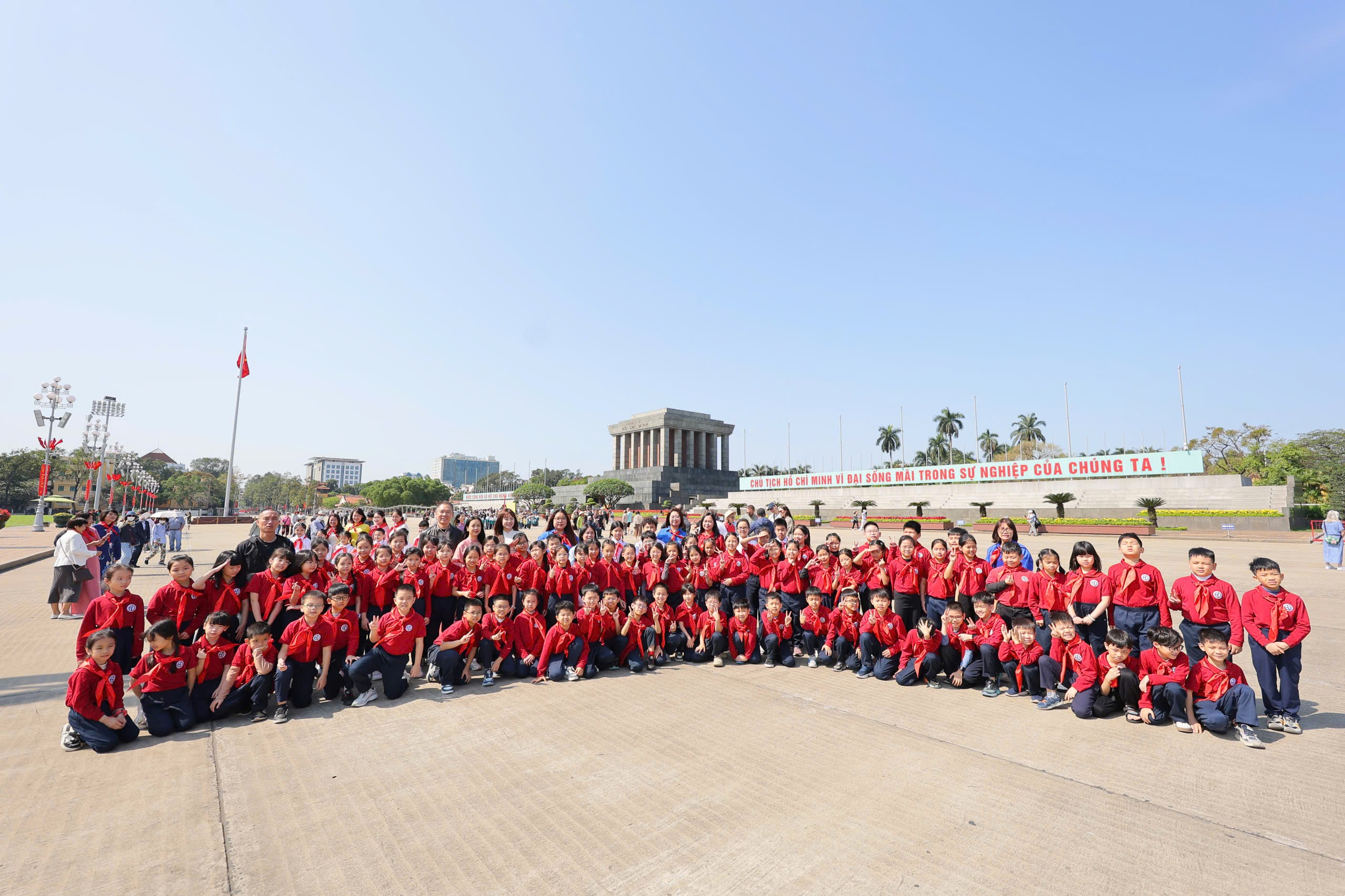 Sau nghi lễ trang trọng, thầy cô và các em học sinh đã vào Lăng viếng Chủ tịch Hồ Chí Minh, bày tỏ lòng biết ơn sâu sắc đối với vị lãnh tụ kính yêu của dân tộc Việt Nam. Tiếp đó, đoàn đã tham quan Khu di tích Phủ Chủ tịch, tìm hiểu nhà sàn và ao cá Bác Hồ – nơi gắn liền với cuộc sống giản dị, thanh cao của Người. Những câu chuyện về cuộc đời và phong cách sống của Bác đã giúp các em học sinh thêm hiểu, thêm kính yêu và tự nhắc mình cố gắng học tập, rèn luyện để trở thành con ngoan, trò giỏi, cháu ngoan Bác Hồ.