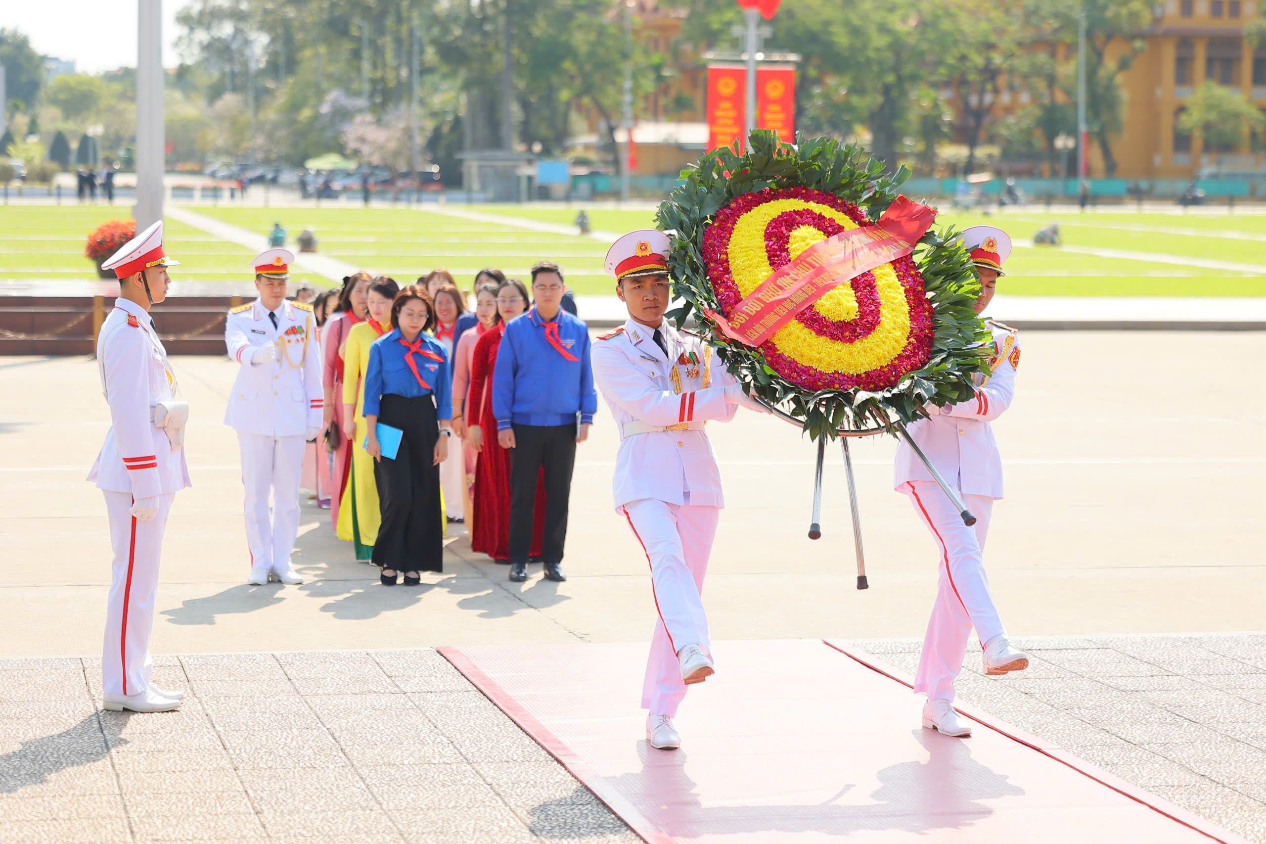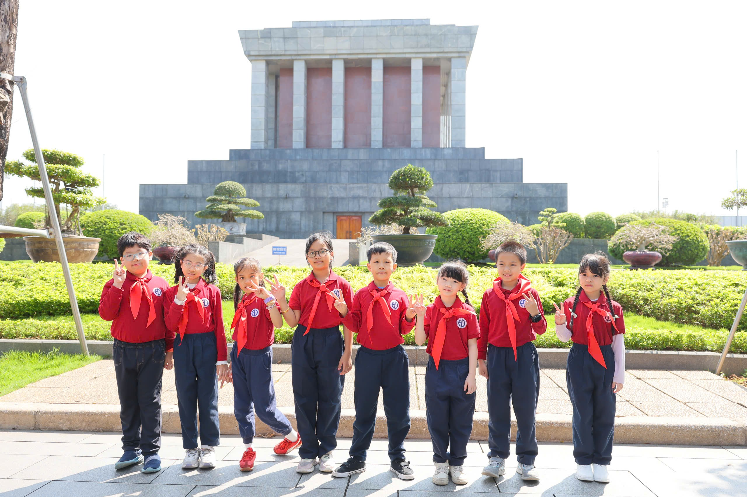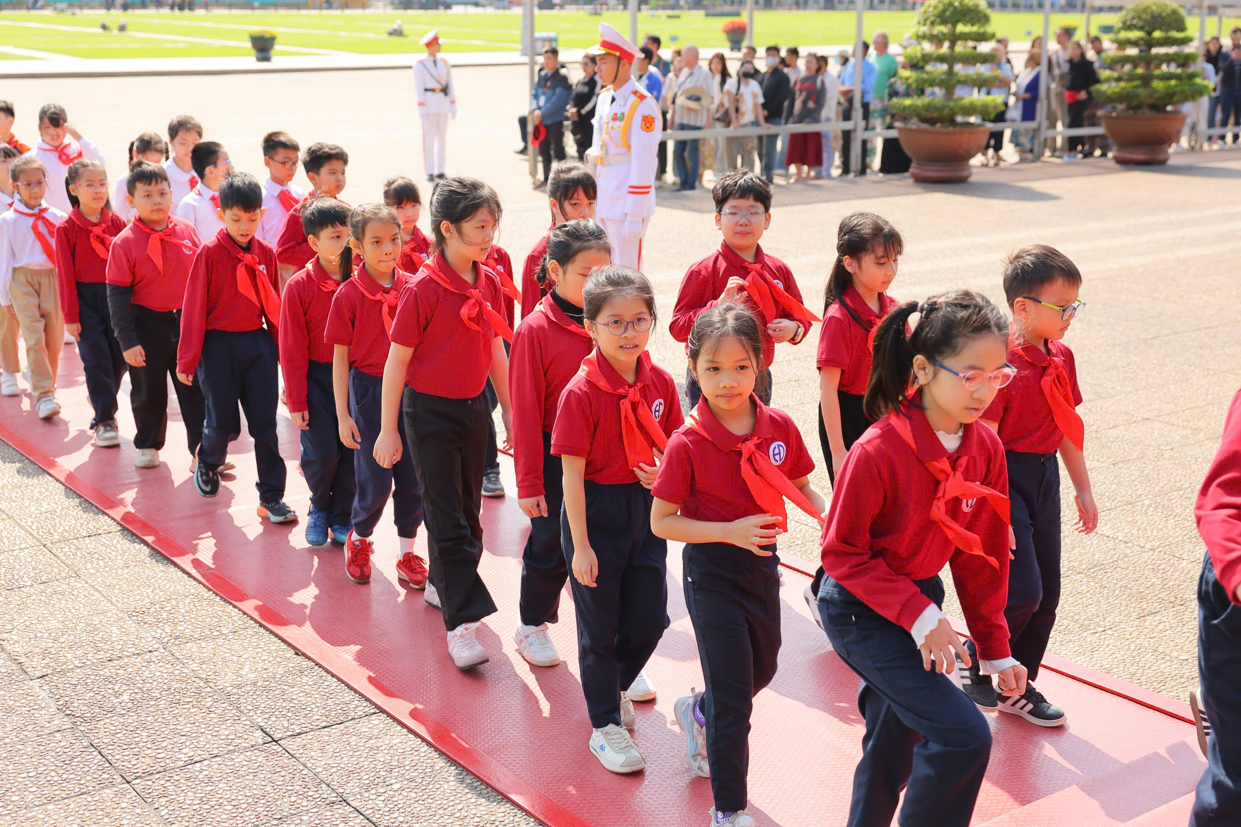Sau nghi lễ trang trọng, thầy cô và các em học sinh đã vào Lăng viếng Chủ tịch Hồ Chí Minh, bày tỏ lòng biết ơn sâu sắc đối với vị lãnh tụ kính yêu của dân tộc Việt Nam. Tiếp đó, đoàn đã tham quan Khu di tích Phủ Chủ tịch, tìm hiểu nhà sàn và ao cá Bác Hồ – nơi gắn liền với cuộc sống giản dị, thanh cao của Người. Những câu chuyện về cuộc đời và phong cách sống của Bác đã giúp các em học sinh thêm hiểu, thêm kính yêu và tự nhắc mình cố gắng học tập, rèn luyện để trở thành con ngoan, trò giỏi, cháu ngoan Bác Hồ.