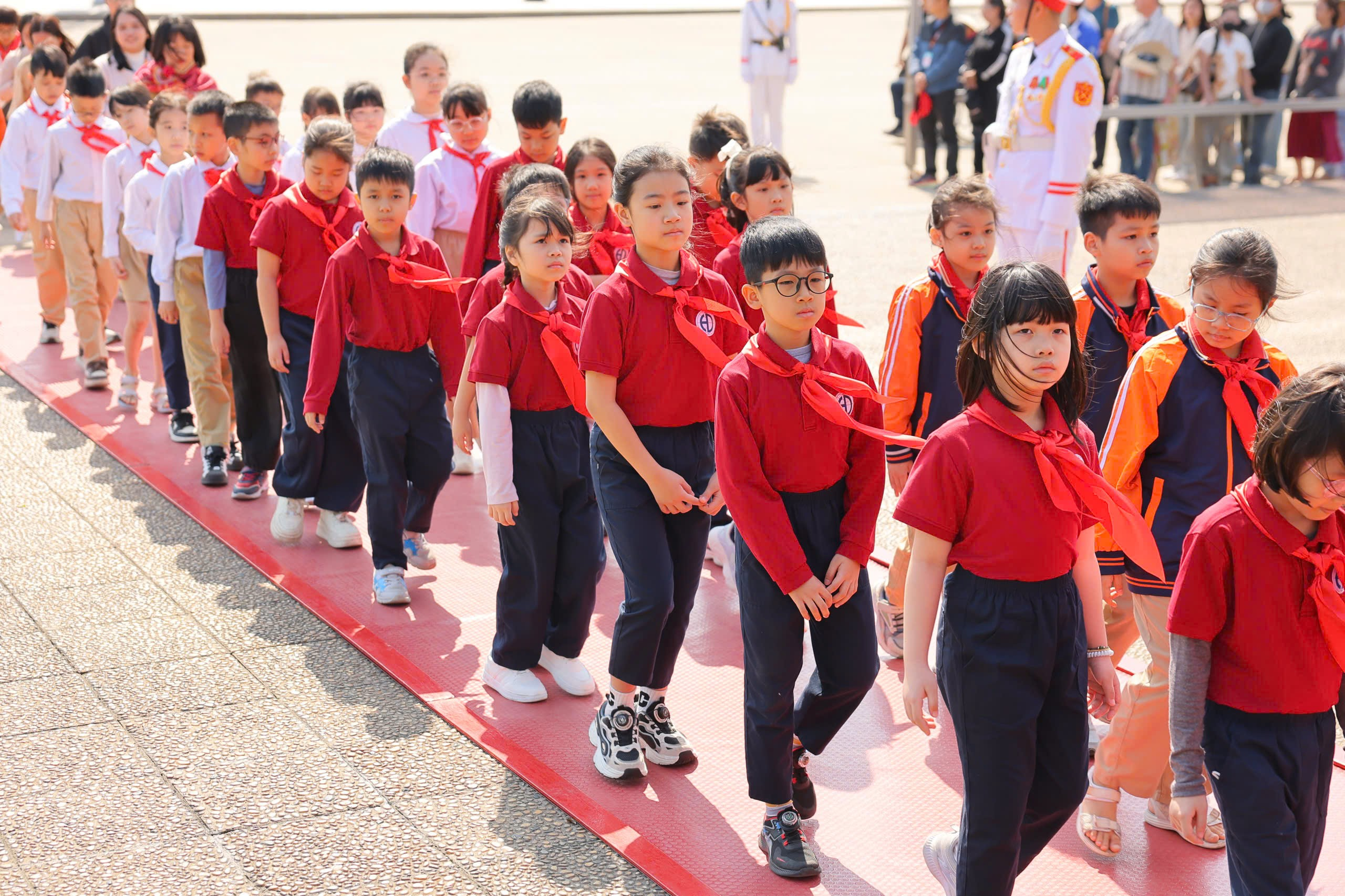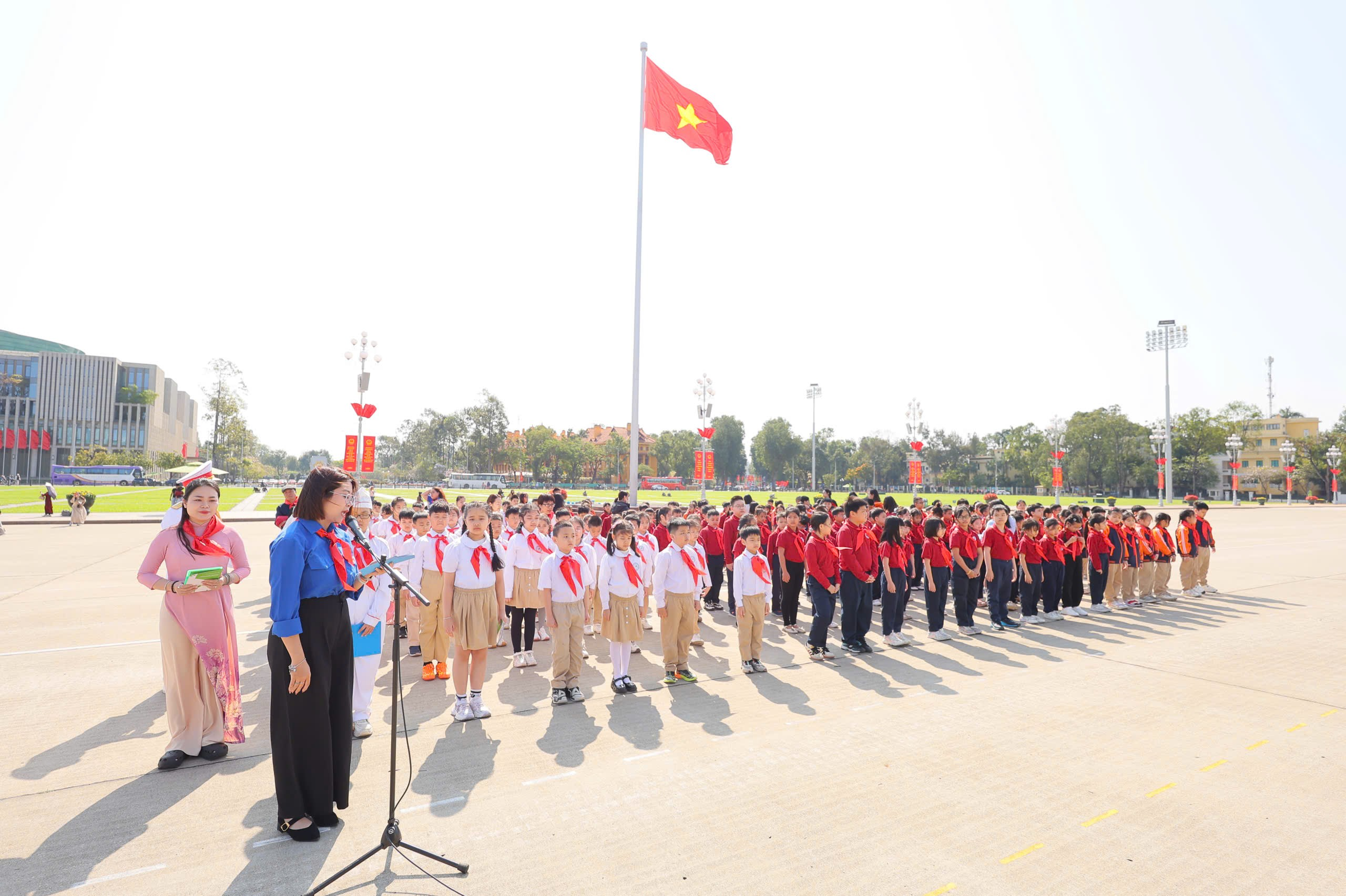 Cũng trong dịp đặc biệt này, Lễ kết nạp Đội viên mới đã được tổ chức trang nghiêm và đầy xúc động ngay tại Lăng Bác. Trước cờ Tổ quốc, cờ Đội và chân dung Bác Hồ, các em nhi đồng tiêu biểu đã vinh dự được đeo trên vai chiếc khăn quàng đỏ – biểu tượng thiêng liêng của Đội Thiếu niên Tiền phong Hồ Chí Minh. Khoảnh khắc các em đọc lời hứa của người đội viên trong không gian linh thiêng của Quảng trường Ba Đình đã trở thành dấu ấn đáng nhớ, khơi dậy niềm tự hào và ý thức trách nhiệm trong mỗi đội viên nhỏ tuổi.