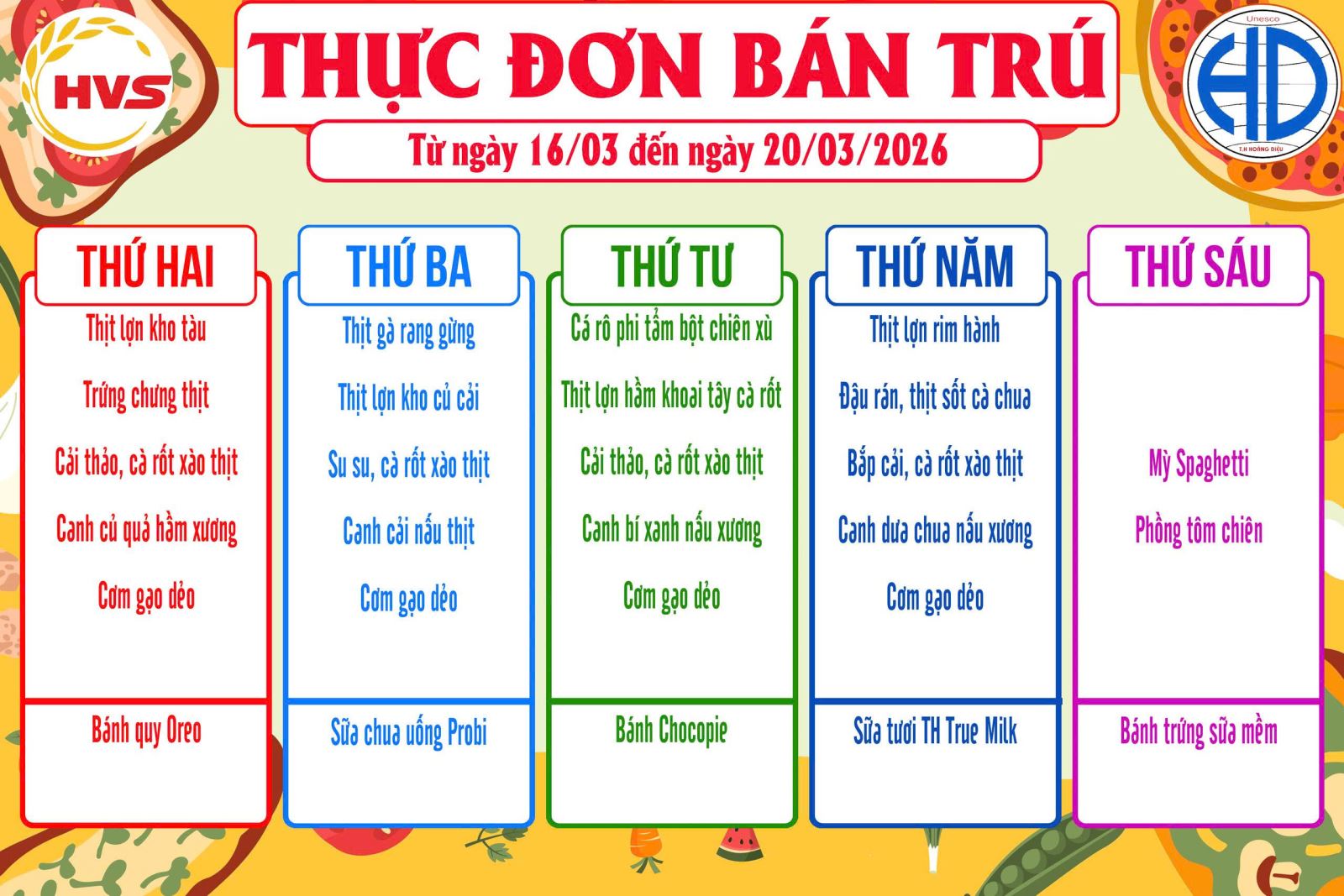 Thực đơn bán trú từ ngày 16 /03 đến 20/03/2026