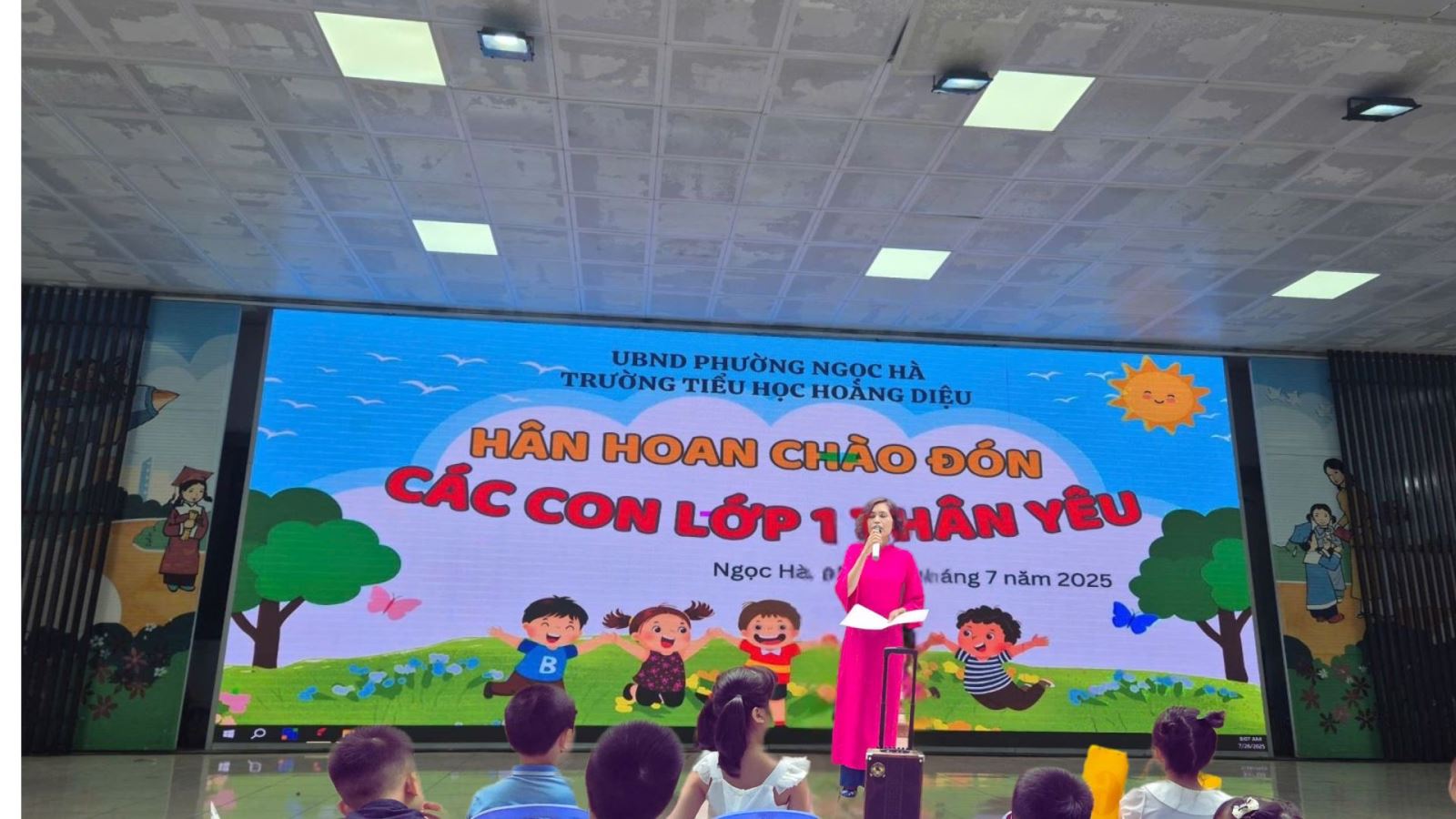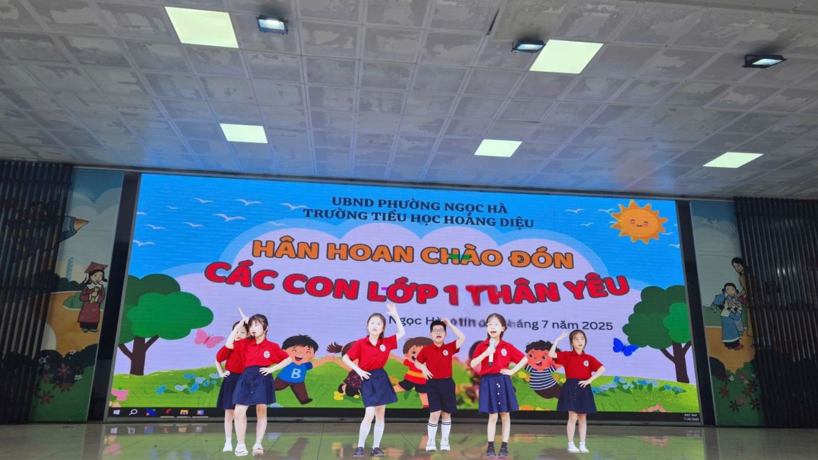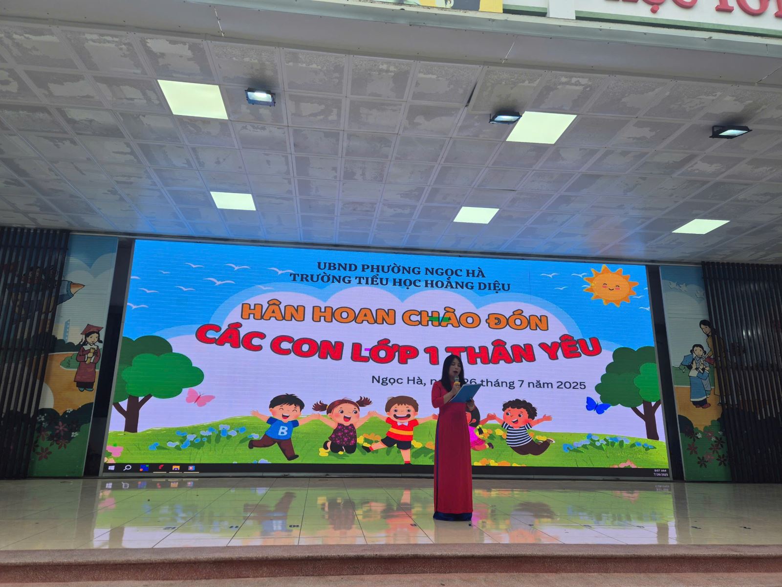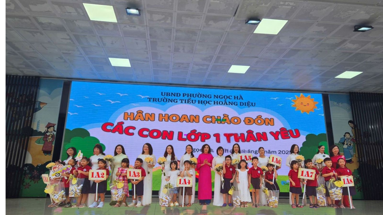 Cánh cổng trường như rộng mở chào đón các em học sinh lớp 1, mở ra một hành trình đầy hứa hẹn, đầy ắp những điều mới lạ và kỳ diệu. Ngày 26/07/2025, không khí rộn ràng, náo nhiệt tràn ngập khắp khuôn viên trường Tiểu học Hoàng Diệu. Tiếng trống vang lên rộn ràng, như một lời chào thân ái, như một lời khích lệ, giúp các em thêm phần tự tin và hào hứng. Nụ cười rạng rỡ trên gương mặt các em như những bông hoa rực rỡ tỏa sáng trong nắng sớm, là minh chứng cho niềm vui và sự háo hức của các em khi bước vào một thế giới kiến thức mới.
