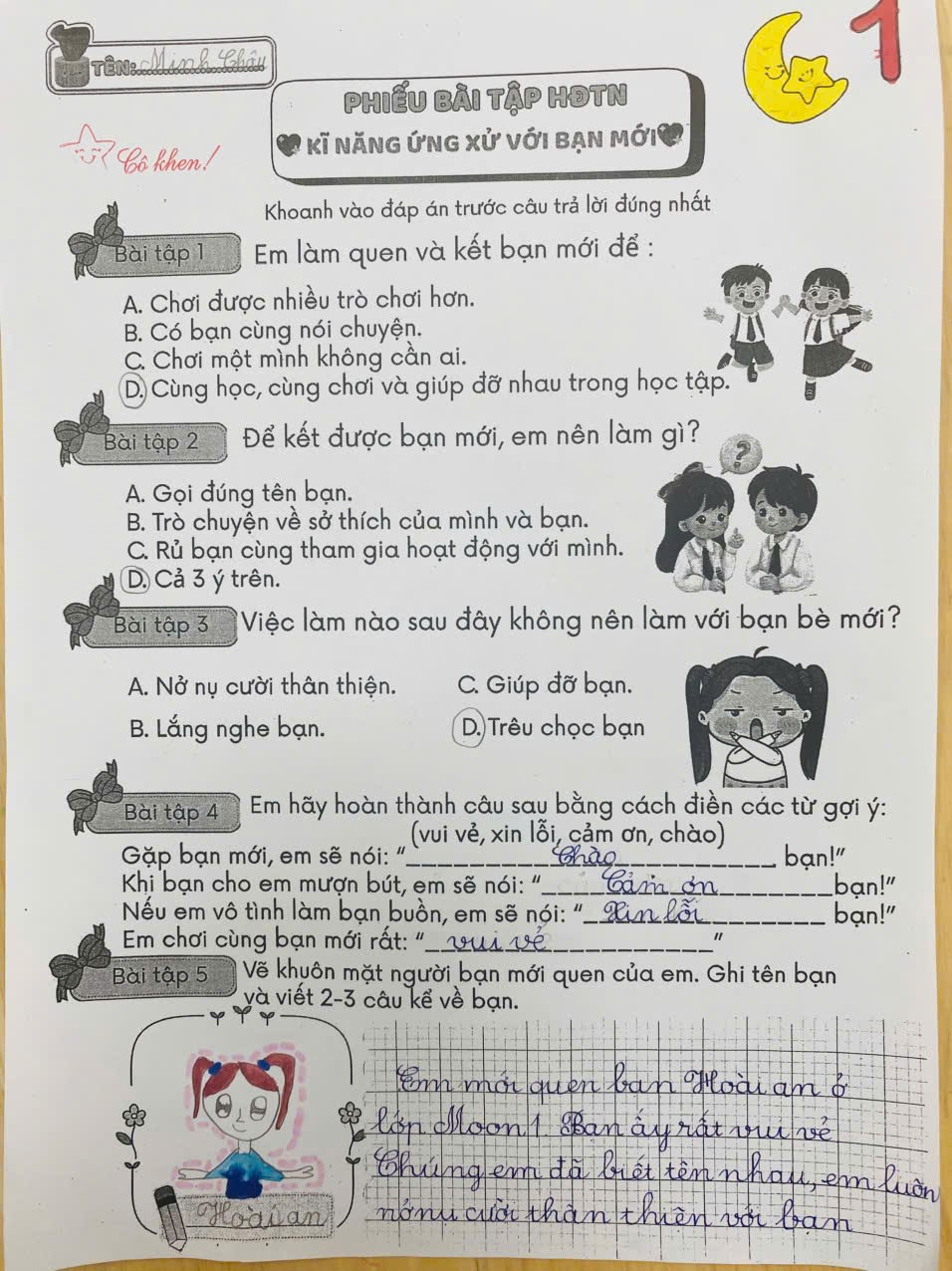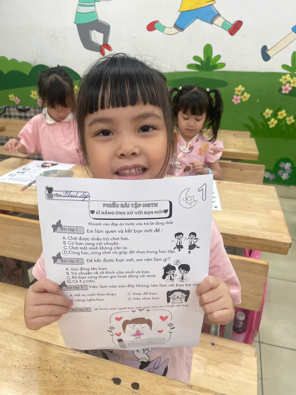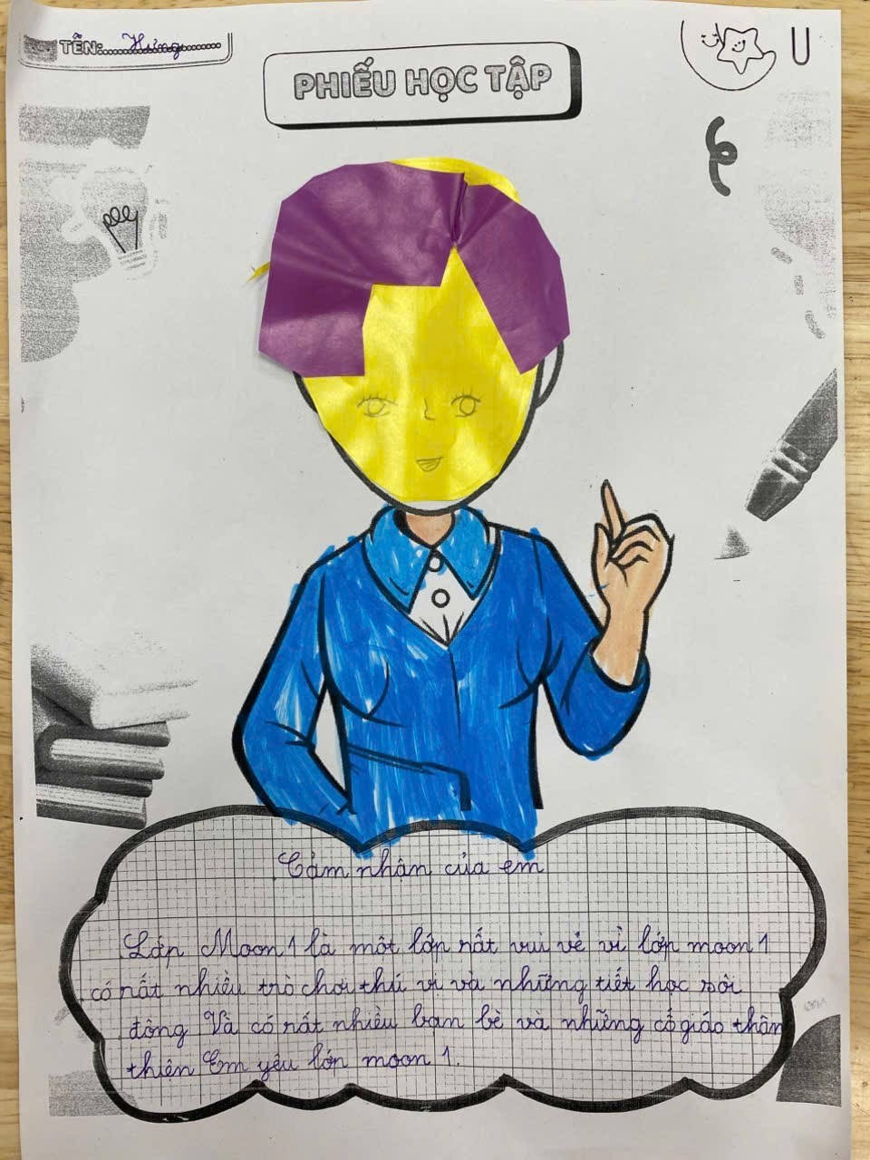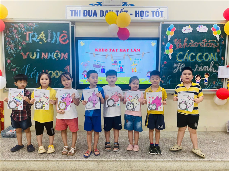 Tại lớp, mỗi tiết học “Khéo tay hay làm” là một hành trình kỳ diệu – nơi các con được thỏa sức sáng tạo với những hoạt động như: xé dán tranh, gấp giấy, làm mặt nạ,…….Không chỉ giúp rèn luyện sự khéo léo và kiên nhẫn, các hoạt động này còn mở ra cho học sinh một thế giới màu sắc – nơi mọi ý tưởng đều được tôn trọng và bay xa.
